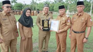 Waris Tholib selaku pembina Apel menyerahkan langsung plakat dan sertifikat kepada Pelaksana Tugas (Plt) Kepala Dinas Kominfo Andrinuka Saptana, pada acara tambahan apel yang berlangsung di Halaman Kantor Walikota Tanjung Balai_Senin (2/1/2023).