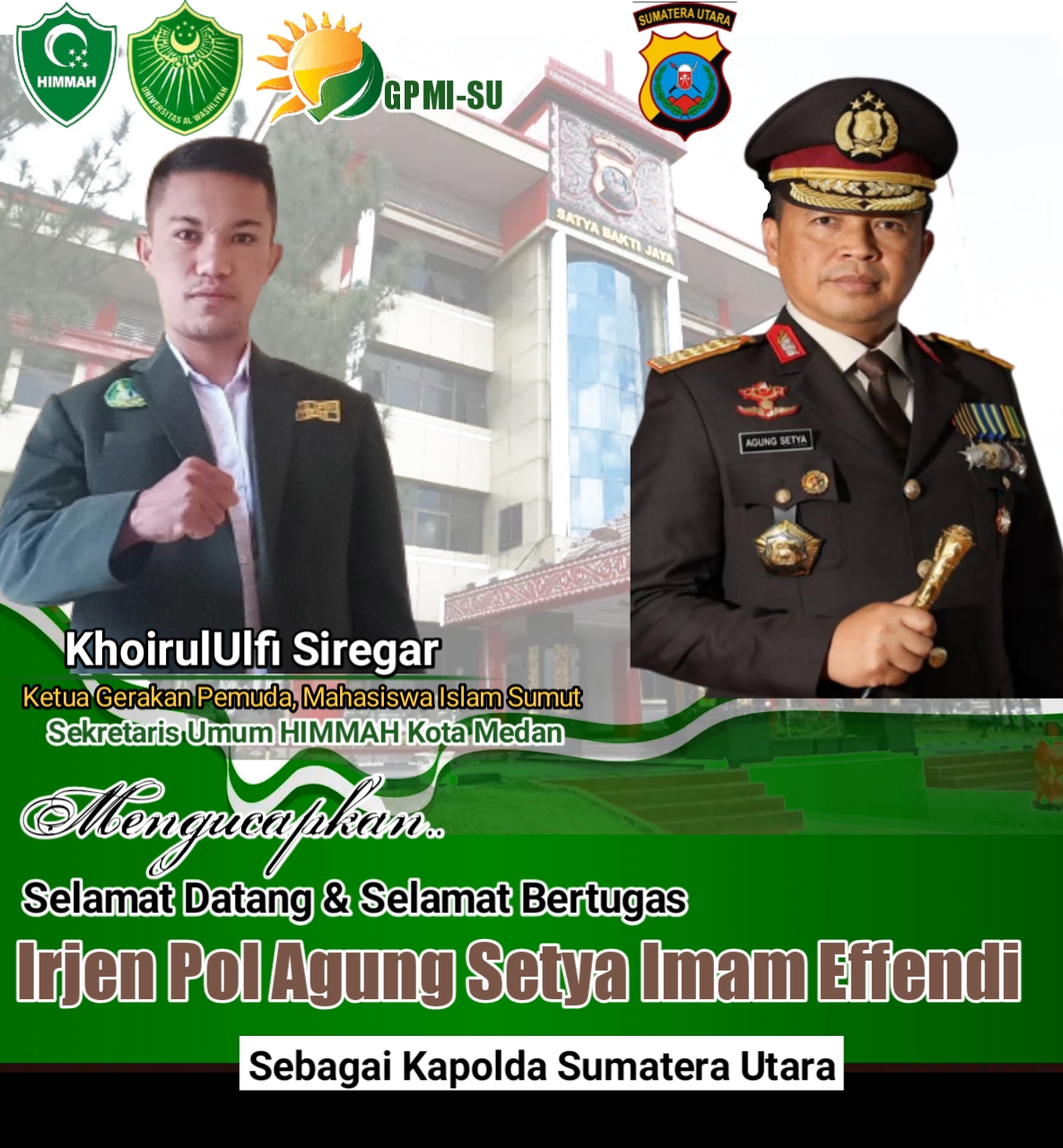 Khoirululfi Siregar Ketua Umum Gerakan Pemuda Mahasiswa Islam (GPMI) Sumatera Utara dan menjabat sebagai sekretaris Himmah Kota Medan, memberikan ucapan selamat datang dan selamat menjalankan amanah mulia kepada Kapolda Sumut Irjen Pol Agung Setya Imam Effendi untuk mengabdi pada rakyat Sumatera Utara.