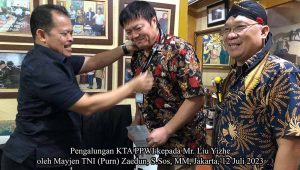 Pengalungan kartu tanda anggota PPWI dilakukan oleh Dewan Penasehat PPWI, Mayor Jenderal TNI (Purn) Zaedun.Ssos.MM, dalam sebuah pertemuan di Jalan Sambas III Jakarta Selatan_Rabu, 12 Juli 2023 lalu. Dalam pertemuan itu juga dibahas berbagai program kerjasama antara PPWI, Koperasi dan UMKM Binaan Mayjen TNI (Purn) Zaedun, dan pihak Mr.Liu Yizhe.