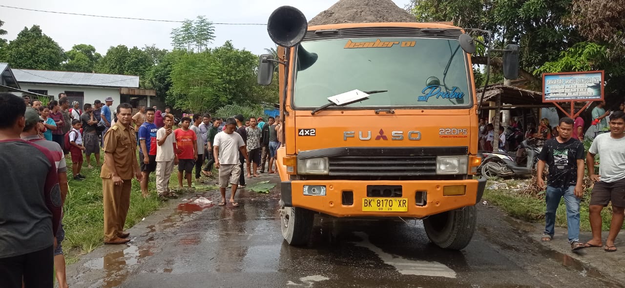 Pada saat yang bersamaan searah dibelakang berjalan Sepeda Motor Yamaha Mio Soul BK 3084 ABU berboncengan dengan seorang penumpang, setibanya di TKP dimana kondisi jalan aspal, berlubang, lurus, cuaca cerah pada pagi hari, arus lalin sepi dan lancar, Sepeda Motor Yamaha Mio Soul BK 3084 ABU tersebut melaju ke kanan hendak mendahului Truck tersebut namun pada saat itu terdapat lubang pada badan jalan yang hendak dilintasi oleh sepeda motor tersebut sehingga pengemudi sepeda motor banting stang kemudi ke kiri dan seketika roda depan sepeda motor tersebut meleset dan miring ke kiri lalu pengemudi dan penumpang sepeda motor tersebut terjatuh ke kiri serta mendarat pada aspal jalan kemudian masuk ke bawah kolong tengah truck sebelah kanan sehingga seketika terlindas oleh roda belakang langsung, korban pun masuk di bawah kolong truck kemudian kakinya putus dan meninggal ditempat.