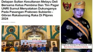 Tersebarnya berita di media bahwa ada Deklarasi di Istana Maimoon dengan judul Delapan Sultan Kesultanan Melayu Deli Bersama Ketua Pembina dan Tim Pagar UNRI Sumut menyatakan dukunganya pada pasangan Prabowo Subianto-Gibran Rakabuming Raka di Pilpres 2024 membuat bingung dan menjadi pertanyaan besar bagi Raja Ramunia Kesultanan Serdang Tengku Sri Maharaja H.Hermansyah.AMP_Rabu (08/02/24).