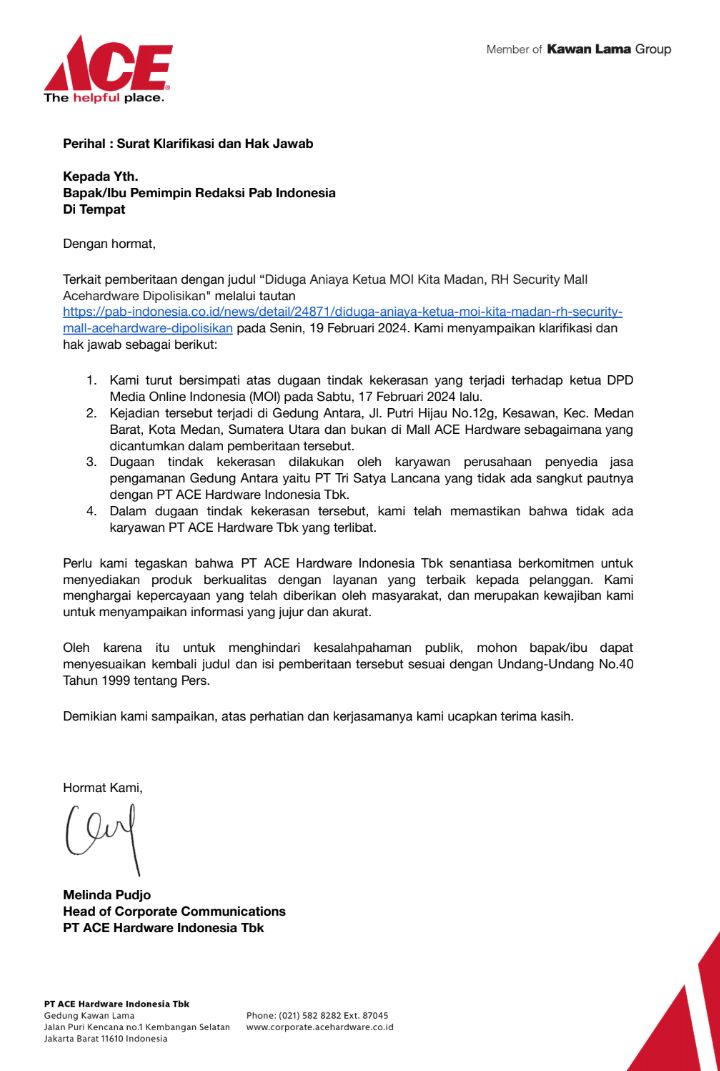 Berdasarkan surat hak jawab, Mall Ace Hardware yang dilayangkan kesalahan satu media online menyatakan bahwa terduga pelaku bukan bagian karyawan atau petugas dan atau tidak ada kaitannya dengan PT.ACE HARDWARE.