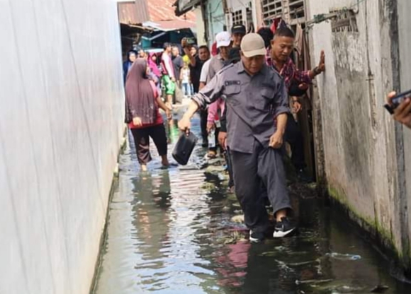 Tanjung Balai_ Walikota Tanjung Balai H.Waris Tholib, meninjau salah satu ruas jalan yang sering tergenang air, tepatnya di Gang Ahmad S, Jalan Letjend Suprapto Lingkungan III Kelurahan Tanjung Balai Kota IV Kecamatan Tanjung Balai Utara Kota Tanjung Balai_Minggu (14/07/24).