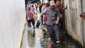 Tanjung Balai_ Walikota Tanjung Balai H.Waris Tholib, meninjau salah satu ruas jalan yang sering tergenang air, tepatnya di Gang Ahmad S, Jalan Letjend Suprapto Lingkungan III Kelurahan Tanjung Balai Kota IV Kecamatan Tanjung Balai Utara Kota Tanjung Balai_Minggu (14/07/24).