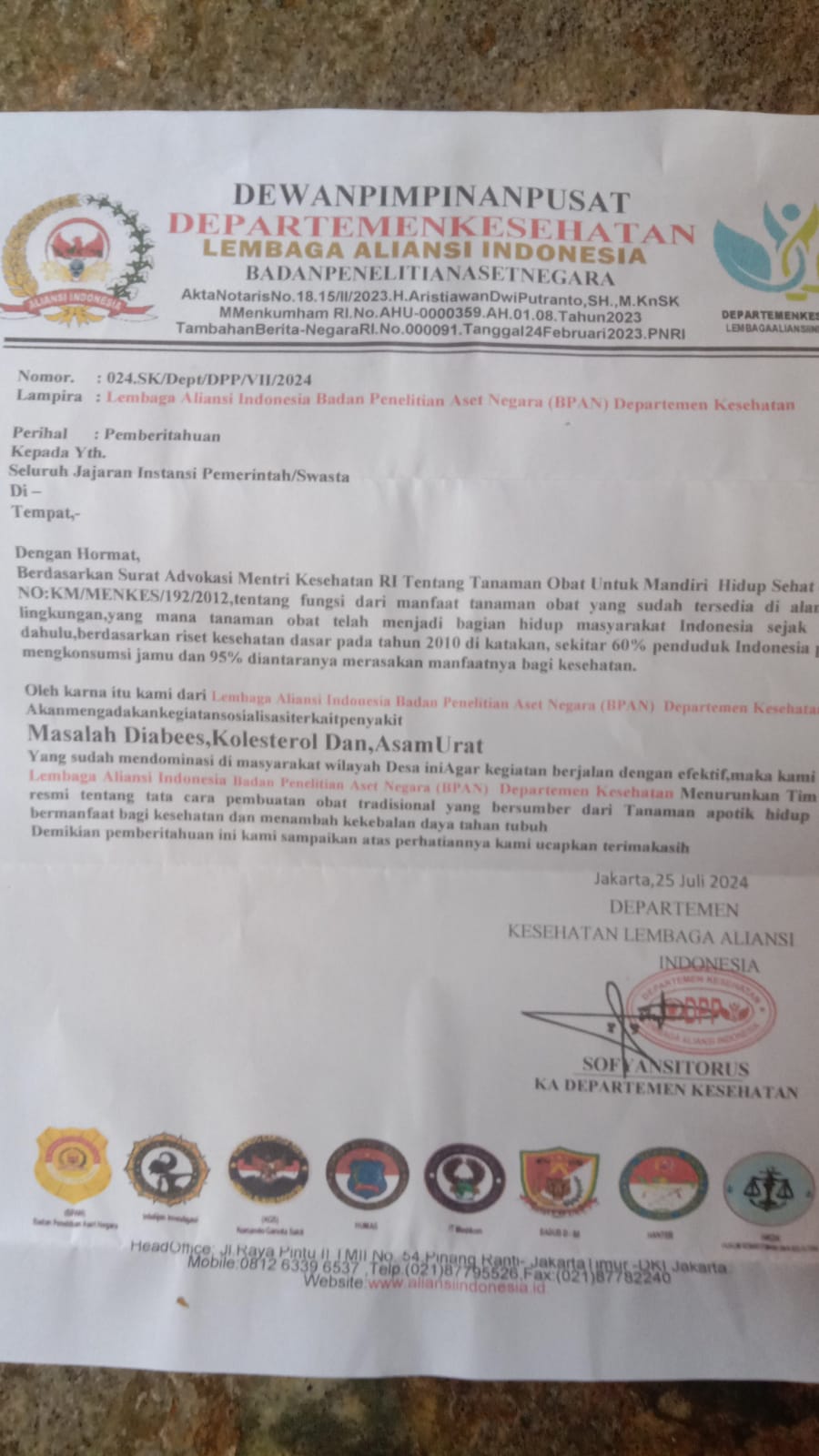 Dewan Pimpinan Pusat (DPP) Departemen Kesehatan Lembaga Aliansi Indonesia (DepKes-LAI) yang merupakan gabungan dari beberapa organisasi kemasyarakatan melaksanakan sosialisasi kesehatan di Kelurahan Karang Berombak Kecamatan Medan Barat Kota Medan_Selasa 30/07/2024.