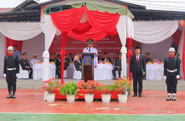 Tanjung Balai_Walikota Tanjung Balai H.Waris Tholib, menjadi Inspektur Upacara Pemberian Remisi dalam rangka peringatan Hari Ulang Tahun HUT Ke-79 Kemerdekaan Republik Indonesia, di lapangan Lembaga Pemasyarakatan (LP) Kelas II B Kota Tanjung Balai, Jalan Masjid Kelurahan Pulau Simardan Kecamatan Datuk Bandar Timur Kota Tanjung Balai_Sabtu (17/08/2024).