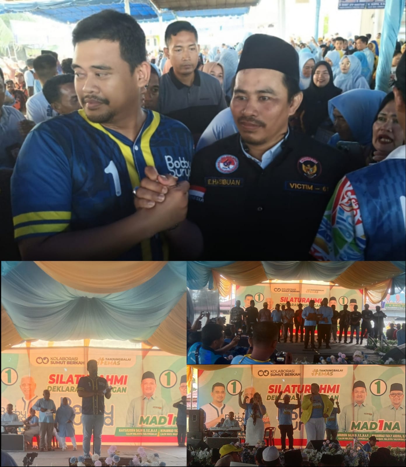 Tanjung Balai_Dimasa tahapan kampanye, pasangan Calon Gubernur Sumatera Utara (Cagubsu) M.Bobby Afif Nasution.SE.MM dan Calon Wakil Gubernur Sumatera Utara (Cawagubsu) H.Surya.BSc dan Calon Walikota Tanjung Balai Mahyaruddin Salim B.SE.MAp, yang berpasangan dengan Muhammad Fadly Abdina.SP.MSi, yang disingkat “Mad1na” itu menggelar acara silaturahmi deklarasi dukungan bersama masyarakat yang dilaksanakan di Jalan Jenderal Sudirman Kelurahan Sijambi Kecamatan Datuk Bandar Kota Tanjung Balai, Rabu (16/10/2024) tepatnya dikediaman Alm.H.Zulkifli Batu Bara.