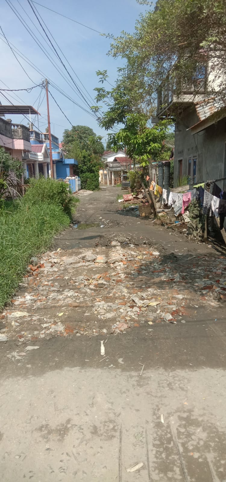 Hal yang sama juga dikatakan Deni (50) dengan menambahkan bagian depan jalan, gotong-royong kami bang menimbunnya pake baru runtuhan bangunan agar bisa juga dilewati kendaraan roda dua dan tiga, tapi tak bisalah semua sebab jalannya sepanjang sekitar 300 meter sedangkan bahannya yang ada hanya segitu, ungkap Deni.