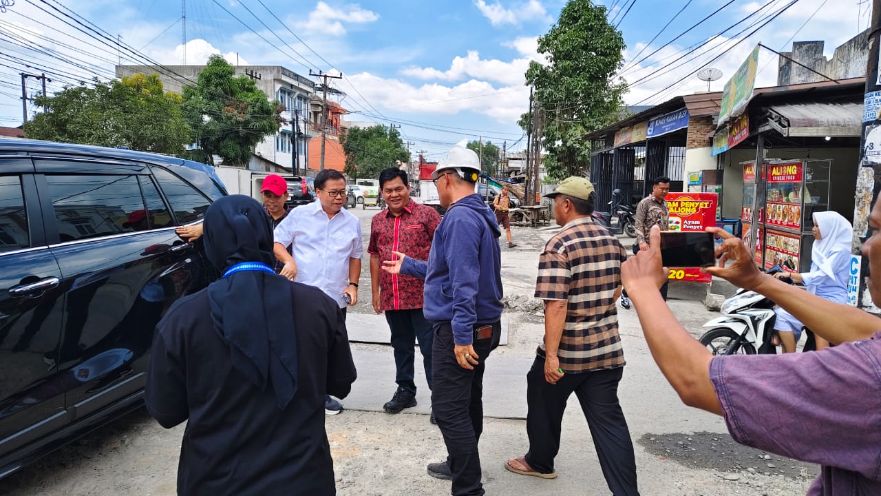 Sofyan Tan terlihat meninjau lokasi Jalan Sunggal Ujung yang masih rusak dampak proyek penggalian drainase dan penanaman box drainase oleh Pemerintah Kota Medan yang sudah selesai dikerjakan.