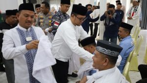 Puncak acara, Walikota bersama Wakil Walikota serta Forkopimda melaksanakan prosesi tepung tawar dan pemberian kain sarung kepada para Jamaah calon Haji.