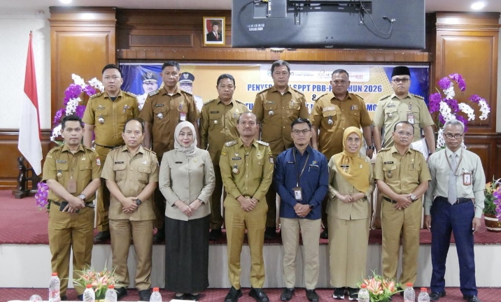 Tanjung Balai_Walikota Tanjung Balai Mahyaruddin Salim, secara simbolis menyerahkan Surat Pemberitahuan Pajak Terhutang (SPPT) Pajak Bumi dan Bangunan Perdesaan dan Perkotaan (PBB-P2) Tahun 2026 dan tagihan Pajak Kendaraan Bermotor (PKB) kepada Kecamatan/ Kelurahan se-Kota Tanjung Balai, Senin (20/4/2026).